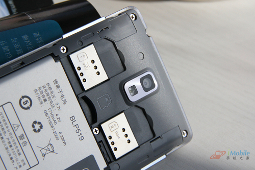 将后盖打开我们看到OPPO R813T设有两个SIM卡槽,双卡双待,可以支持一个3G一个2G卡同时待机,其中一个卡槽兼容3G、2G,另外一个只支持2G。