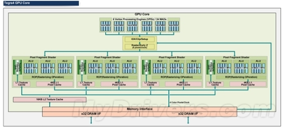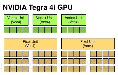 Tegra 4 GPU各方面都比上一代扩充了不少,总计拥有72个核心,包括48个像素核心、24个顶点核心。Tegra 4i将顶点核心砍去一半,只留下12个,像素核心则保留48个,总计为60个,不过Vec4像素单元从四个较小的变成两个较大的,每个负责领导24个核心。