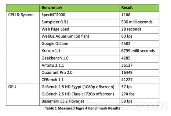 因为没有设备,这个谁也不好说,只能参考NVIDIA官方数据。以下来自一款1.9GHz Tegra 4参考平板。
