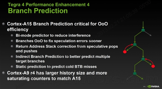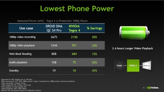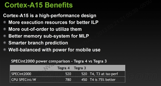 更多执行资源以提升ILP、更多的乱序利用、更好地内存子系统以提升内存级并行(MLP)、更智能的分支预测、平衡的移动应用功耗……这些都是说A15架构的功耗控制特性的,而下方两行展示了Tegra 3、Tegra 4的功耗对比。