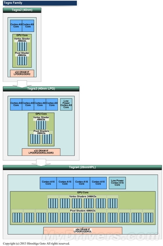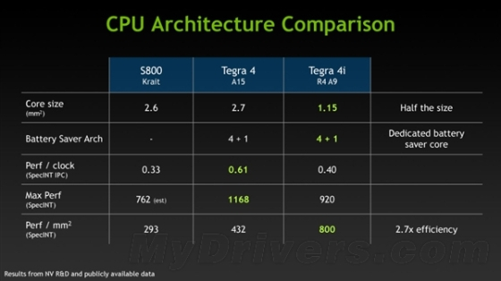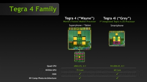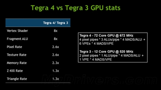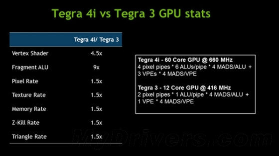 Tegra 4 GPU最高频率提升到了672MHz,上代为520MHz,Tegra 4i则是660MHz。