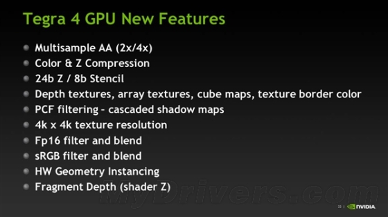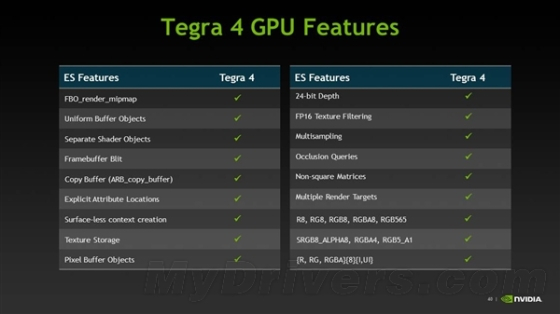就目前而言,OpenGL ES 3.0支持与否并无太大实际意义,但不支持的话至少在规格上就输了一筹,而且这是大势所趋,一两年后等游戏大量使用它了Tegra 4就会很吃亏。