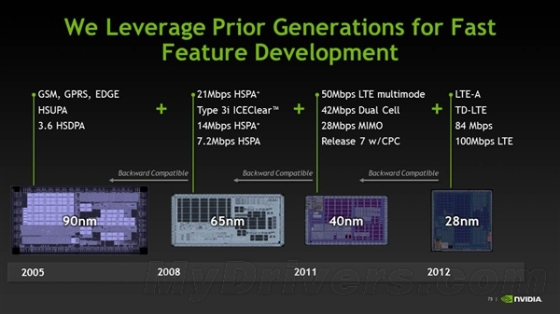 Icera基带更偏向软件这一侧,外置收发器处理向下转换之后就是完全软件的了。这样如何保证竞争力?秘密就在工艺上,NVIDIA选择了侧重性能的28nm HPM,而不是注重功耗的LP、HPL版本:使用高性能工艺,关闭不用的模块,而不是做一个更大、漏电率更低的SoC。NVIDIA宣称,这样可以让i500的面积比高通的MDM9x15小大约40%。