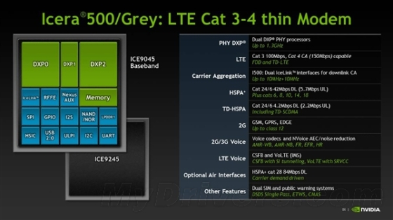 独立的基带芯片Icera i500是伴随Tegra 4发布的,Tegra 4i里整合的也是这个,只是去掉了USB界面,内存子系统也略有不同而已。