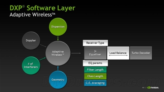 NVIDIA毫不吝啬地公布了C、D的数据路径,可以看出在LTE配置中一个核心负责所有的反向快速傅立叶变换(FFT)和MIMO矩阵数学,第二个核心负责速率匹配与解码,二者负载基本相同,而且可以通过软件控制让每个核心都运行在尽可能低的频率和电压上。