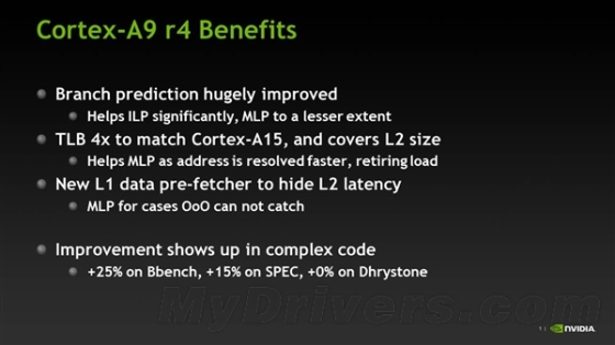 NVIDIA宣称,A9 r4p1相比于r2p9可以在SPECint_base测试中获得15%的成绩提升,仅仅是架构微调就获得如此好的整数性能改进着实惊人,当然真实情况如何还不太好说。不管怎样,配合2.3GHz的最高频率,Tegra 4i CPU性能会比Tegra 3好不少。