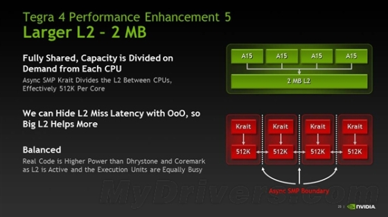 缓存容量上,一级还是32KB指令、32KB数据,但是二级增至2MB,并为所有核心共享(Tegra 4的第五个节能核心还有自己的512KB二级缓存),任何核心只要允许都可以单独占用全部2MB二级缓存。