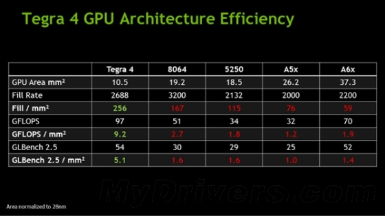 NVIDIA宣称,SPECint2000测试(可充分压榨CPU资源)中Tegra 4/3的单线程整数成绩是相同的,但是Tegra 4的功耗要低40%,再用性能除以功耗,Tegra 4在能效方面要胜出75%。