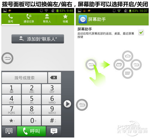 除了“屏幕助手”,在部分界面中,中兴Grand Memo也进行了优化,比如在拨号面板中,我们可以讲拨号面板偏左或偏右放置,这样用左手或右手单手拨号就会更加容易了。