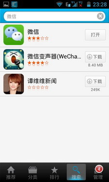 另外,这款手机同样支持窗口小部件功能,方便用户为桌面添加常用工具。此外,在手机的应用程序列表右上角,华为Y500还加入了一个“应用商城”图标,点击该图标则可以直接打开该机自带的软件商店——MM商场。