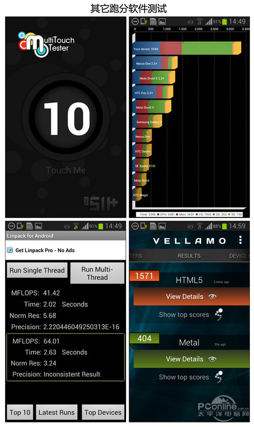 另外,我们拷贝了5钟1080P格式的视频进去,分辨为flv/mp4/mkv/avi/rmvb,其中rmvb不能硬解播放(可以通过软件软解播 放),其它几种格式都完美播放。而续航方面我们也简单测试了下,我们在1/5音量运行《Ssphalt 7》,从满电到用完关机坚持了4个小时,运行过程中手机为空载,即放在桌面上自己运行。