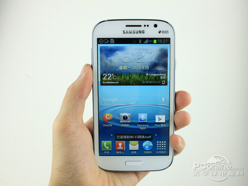 三星I9082外观上还是延续了三星I9300以来的一贯圆润风格,正面一块5英寸的大屏幕很打眼。由于采用了一块5英寸的大屏幕,所以单手握持起来还是感觉较为撑手的。但其圆润的设计风格又让人产生一种娇小的错觉。