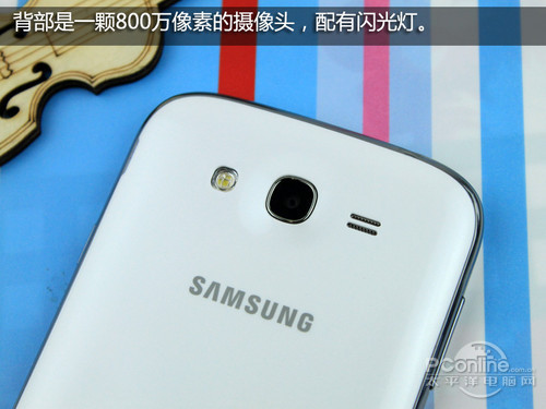 背面三星I9082将闪光灯、摄像头、扬声器都集成在了手机顶部,而摄像头像素为800万,也颇为主流。