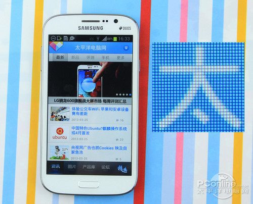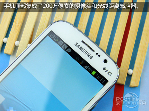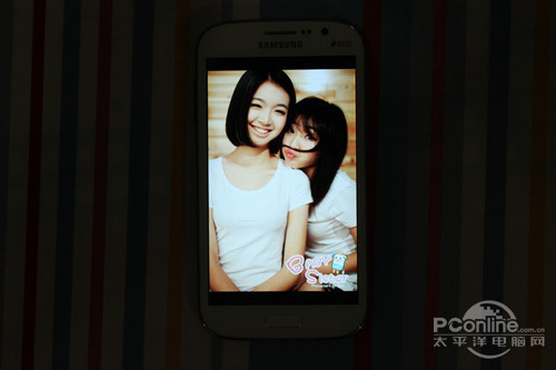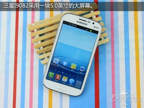 三星I9082采用的是一块5.0英寸的屏幕,分辨率为800×480,材质不再是AMOLED,而是TFT LCD,PPI为187,屏幕精细程度一般,但所幸屏幕采用的是标准RGB排列,屏幕细腻程度上有所挽回。所以虽然5.0英寸的屏幕上只分布了 800×480个像素点,但肉眼看上去这块屏幕的精细程度还是可以接受的。