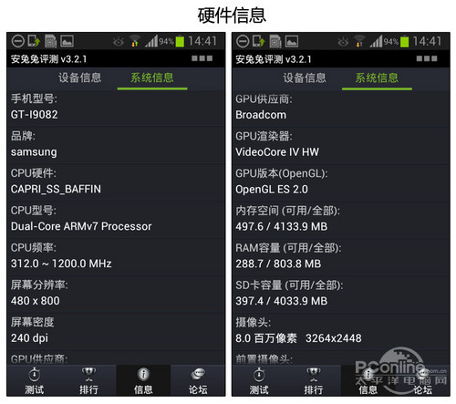 三星I9082采用了一颗1.2GHz主频的双核处理器,具体型号博通BCM28155,GPU上的Boradcom也证明了这一点。机器还配备了1GB RAM和8GB ROM,可用内存不是很多,大家日常可能要配合内存卡使用。