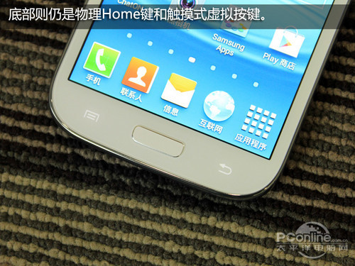 机器屏幕上方为光线距离感应器和200万像素的前置摄像头,下面则是隐藏式的触控式虚拟按键,当然三星标志性的物理home键也一并保留了。