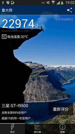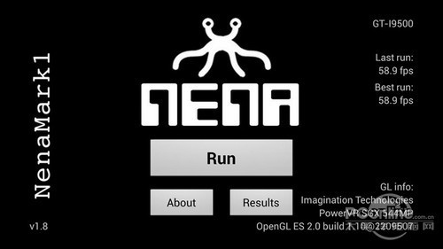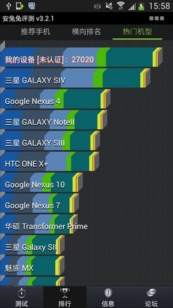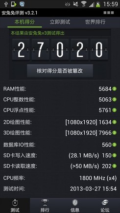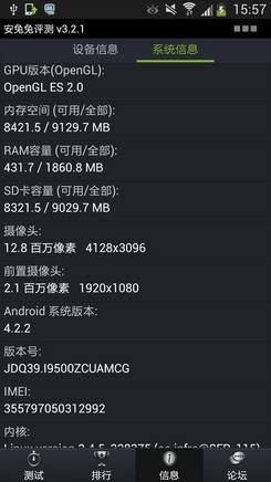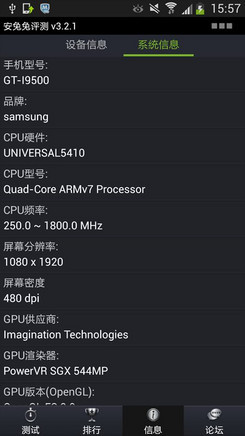 下面我们来看三星GALAXY S4的硬件配置信息,在安兔兔的系统信息中,我们看到GALAXY S4的CPU型号为5410,也就是Exynos 5410,GPU为PowerVR SGX 544MP。而1.8GHZ的主频和Quad-Core(四核)似乎表示目前只有四个核心A15核心在工作,亦或是安兔兔暂时还无法正确识别处理器。