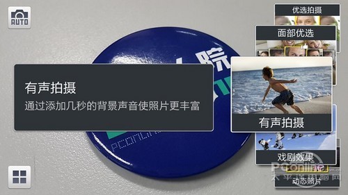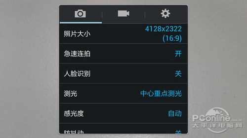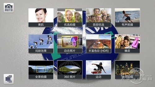 设置选项中可以针对照片或视频的尺寸、测光方式、感光度ISO、防抖、人脸识别等功能进行设置。下面我们来看GALAXY S4的全新拍照模式选择界面。