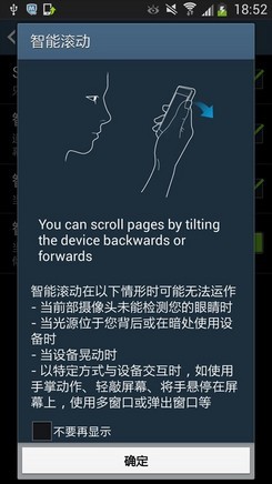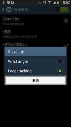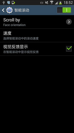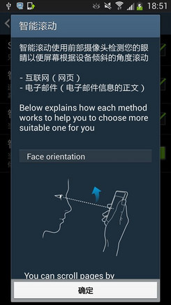 智能滚动有两种方式,一种是根据手腕的角度,另一种是根据人脸追踪,滚动的速度也可以进行设置。当手机屏幕检测到人脸后,根据眼睛的上下转动,屏幕也随着进行滚动了。而感应手腕只不过是普通的重力感应。