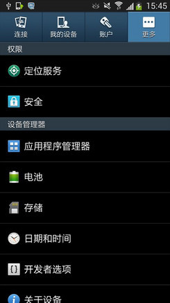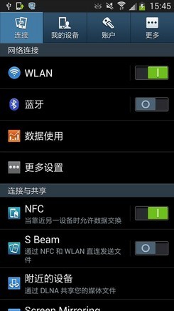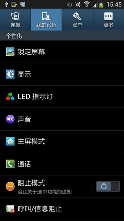 总的来说,整体的设计风格还是与GALAXY S3大致相近的,设置项被分为了连接、我的设备、账户以及更多四大项,简化了升菜单的层级,相比之前集成到一起的做法要更便于快速查找设置项。