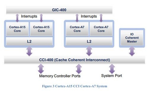 big.LITTLE处理的设计旨在为适当的作业分配恰当的处理器。Cortex-A15处理器是目前已开发的性能最高的低功耗ARM处理器,而 Cortex-A7处理器是目前已开发的最节能的ARM应用程序处理器。可以利用Cortex-A15处理器的性能来承担繁重的工作负载,而 Cortex-A7可以最有效地处理智能手机的大部分工作负载。这些操作包括操作系统活动、用户界面和其他持续运行、始终连接的任务。