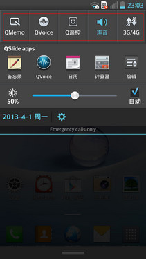 同时,这款手机还支持下拉通知栏快捷方式,而且拥有WLAN、蓝牙、声音、飞行模式以及QMemo等多个常用设置的开关,而且支持用户自定义,为用户的日常使用提供了方便,而且十分人性化。