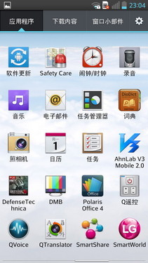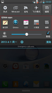 除了常用设置的开关之外,在下拉通知栏中该机还拥有LG手机特有的QSlide apps,其中包括视频、DMB、互联网、备忘录、QVoice、日历以及计算器共六个程序图标,而且允许用户自定义——是否让其显示在下拉通知栏中。