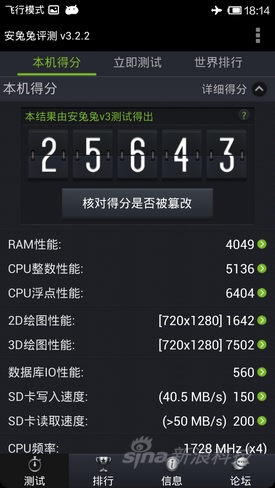 因为时间关系,新浪手机仅用安兔兔一款软件进行了跑分测试,在“性能模式”下进行反复测试多次,小米2S的得分基本都在25000分左右。这与雷军在今天的发布会公布的结果一致。