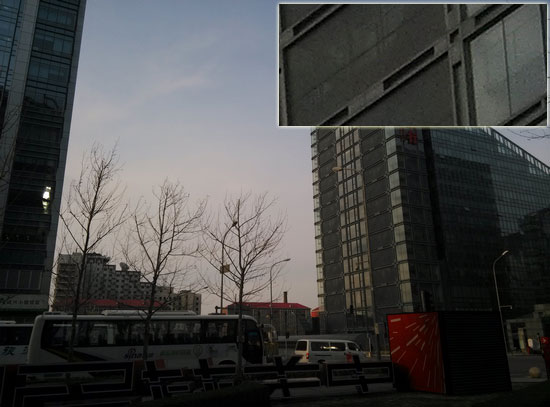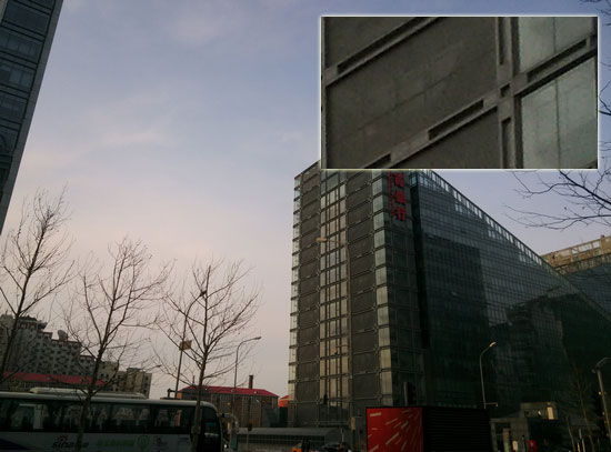 另外,这张图片放大细节可见涂抹现象(注意建筑上纱网的部分)。实际上,在新浪手机测试的多数手机中,包括近期的旗舰产品,这点表现的都比较一般。