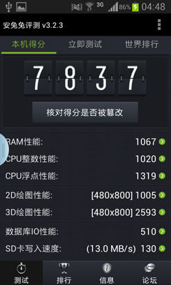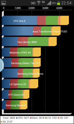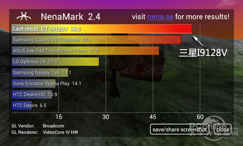 手机的图形处理性能良好,在NenaMark1和NenaMark 2.4两个测试软件当中,成绩均超过55fps,让人满意。另一方面,之前我们有同事用了5段不同格式的1080p视频测试过同样是搭载同款处理器的三星 I9028,其中flv/mp4/mkv/avi能通过硬解完美播放,rmvb格式则要借助软件解码。