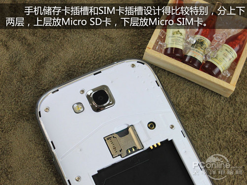 手机的SIM卡和储存卡卡槽设计比较特别,分开上下两层,且因为节约空间的需要,SIM卡卡槽只支持放入Micro SIM卡。