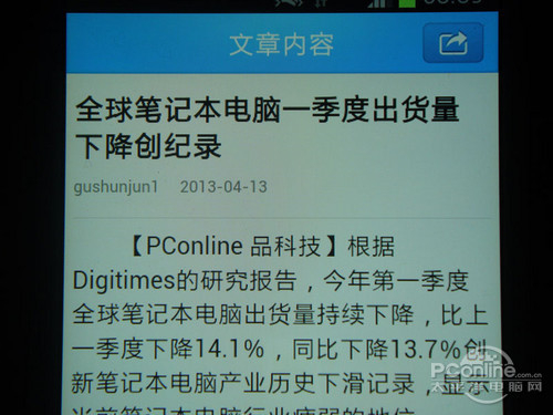 因为屏幕尺寸为5英寸,分辨率停留在800x480的阶段,所以靠近屏幕看时文字显示效果会较为粗糙,但在正常距离观看不算很明显。