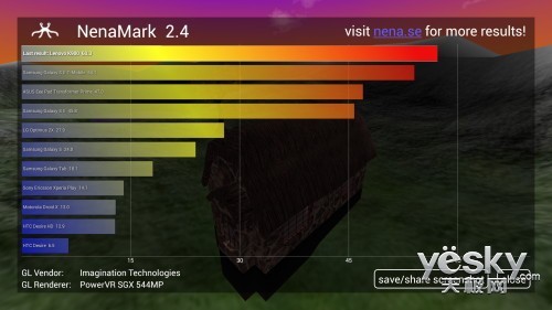 而在NenaMark 2.4对联想K900的3D图形性能测试中,60.1fps的成绩也非常出色,要知道分辨率越高,图形测试高分就越困难,而联想K900以1080P(1920x1080)分辨率取得这样的分数表现非常不错,完全能够流畅的运行各种大型游戏。