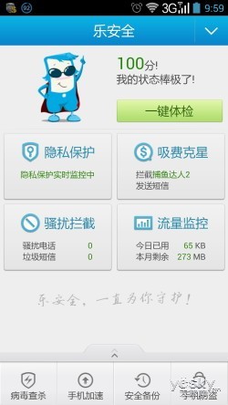 乐安全是联想的一款特色安全手机应用,具有防偷窥、防盗失、防病毒、防病毒、防骚扰、防吸费,以及私密模式、访客模式、儿童模式的“五防三模”等多项安全防护功能,可以有效保护智能手机远离手机病毒、吸费陷阱,保障用户手机的个人隐私不丢失、不泄露。