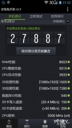 跑分测试上,首先我们使用了Antutu性能测试软件对联想K900的综合性能进行测试,通过“内存性能”、“CPU整数性能”,“CPU浮点性能”、“2D、3D绘图性能”、“数据库IO”、“SD卡读、写速度” 8项性能测试对手机的硬件性能做一个整体评分。
