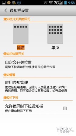 同时联想K900对顶部的通知栏也进行重新设定,加入了很多自定义的个性元素,我们能够通过“通知栏设置”来对开关页面样式、开关位置、通知管理等进行操作,体现了联想K900贴心以及人性化的一面。