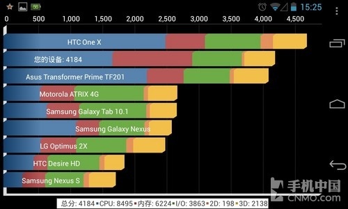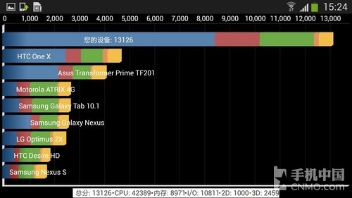 在Quadrant Advanced测试中,GALAXY S4仍占有明显优势,分数为13126,Nexus 4的成绩是4184。对比下来,跟安兔兔的测试结果大致相同,差距主要还是集中在CPU和内存方面。