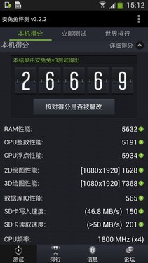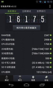 配置方面,两者主要的差距还是在于处理器方面,GALAXY S4在硬件上占据优势,而这种优势也延续到了综合测试当中。从上面的安兔兔跑分可以看出,GALAXY S4的最终成绩为26669,Nexus 4的最终成绩是16175。其中,差距主要出现在RAM、CPU整数、CPU浮点方面,而绘图、数据库和SD卡读写方面相差并不大。