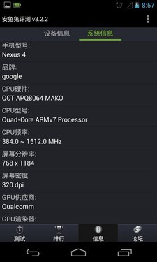 之前已经提到过,两款手机的硬件配置均达到了主流水平。其中,三星GALAXY S4搭载了一颗型号为Exynos 5410的双四核处理器,它内部包含了一个1.2GHz的A7四核CPU和一个1.8GHz的A15四核CPU,运行内存为2GB。而Nexus 4则是搭载了一颗主频为1.5GHz的高通骁龙APQ 8064四核处理器,运行内存同样达到了2GB级别。