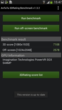 安兔兔3D提供了3D score和Off-screen两种测试结果,前者是结合分辨率和图形处理器来测试图形性能,后者则是在关闭屏幕的模式下,不考虑屏幕分辨率,直接测试 图形处理器性能。在两项测试中,GALAXY S4再次胜出,这也证明了其图形处理器性能的强悍。