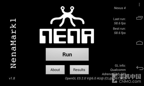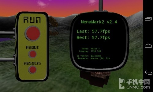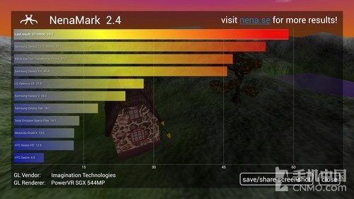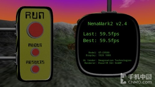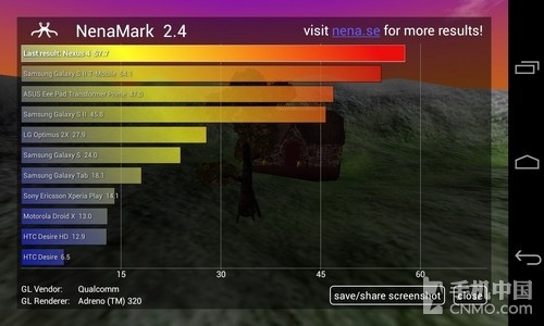 NenaMark1是一款用于Android设备的硬件加速基准测试程序,通过演示一段实时渲染的画面来对设备的图 形能力进行测试,包括反射、动态阴影、曲面参数、复杂光线模式等内容。而NenaMark2则是前者的升级版,测试方式大致相同,通过运行一段动画来得出 fps值。与之前的安兔兔3D测试不同,此次两者的差距并不是很大,GALAXY S4稍稍领先于对方。