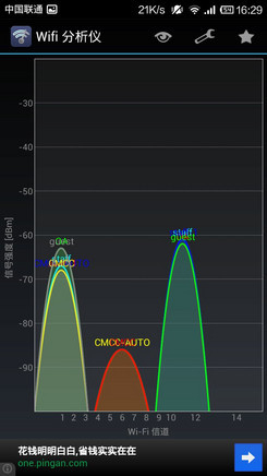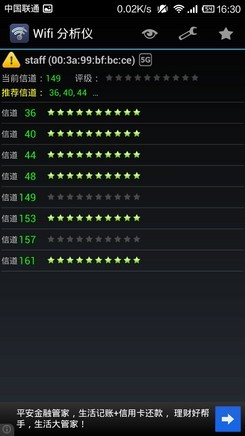 从上图可以看出在2.4GHz的频段中,WiFi热点众多,而且单一信道里面拥有的热点数很多,造成拥堵;相比较2.4GHz频段,5GHz频段的信道更为宽阔,即使同一信道有众多热点,但是较宽的信道也能有着不错的网络表现。