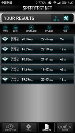 测试一:我们利用支持5G WiFi的手机分别单独进行频段的锁定,包括5GHz与2.4GHz,继而运行Speed Test,服务器选择广州进行五次速度测试,取平均值,以此来考察下载的速度。由于受到网络状况等因素影响,测试结果仅供参考。