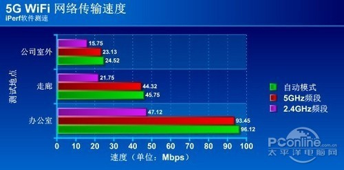 首先我们看到在办公室内,5GHz频段的信号比较优秀,因此自动模式与5GHz频段下速度都有很厉害的表现,接近100Mbps的传输速度;走廊位置, 信号有所减弱,速度下降不少,但仍然要比2.4GHz频段要快不少;公司室外的信号更加薄弱,速度再一步下降,但仍然有领先。