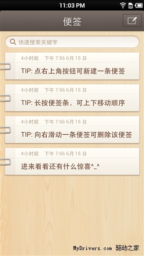 MIUI和锤子ROM的便签均采用了拟物风格,但排列方式略有不同。CM10.1中并没有提供便签功能。