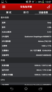 继首款高通骁龙800处理器手机XL39h后,Xperia Z1再次搭载这枚强大处理器。2.2GHz主频四核CPU+2GB RAM带来的流畅度是显而易见的,流畅到笔者已经不想再提,跑分已是浮云的程度了。