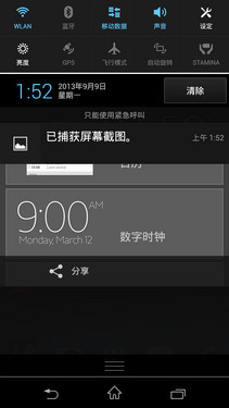 大屏使然,Xperia Z1也在界面上进行了针对优化,最直观的就是每个层级能承载的信息变多了。如在锁屏界面除左滑右滑,我们能进入自定义的快捷任务(日历、启动相机等)。再 如,下来通知栏的快捷开关增加到了两排,而程序列表左侧也能多了一个侧边栏,用以管理应用程序。不过,关机菜单仍然还只有“关机”与飞行模式两个功能,这 也是可以丰富功能的地方。