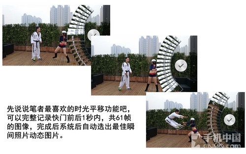 首先说说笔者最喜欢的时光平移吧,这功能简直就是抓拍神器。它可以完整记录快门前后1秒内,共61帧的图像,别小看 这快门前一秒的时间,事实上很多人按下快门时就已经错过了最佳瞬间。完成后系统还会自动选出最佳瞬间照片。而滑动弧形图片轨迹我们还能看到类似gif图片 的连续效果,有趣而直观,也是方便我们将一个瞬间动作制成动态图片。