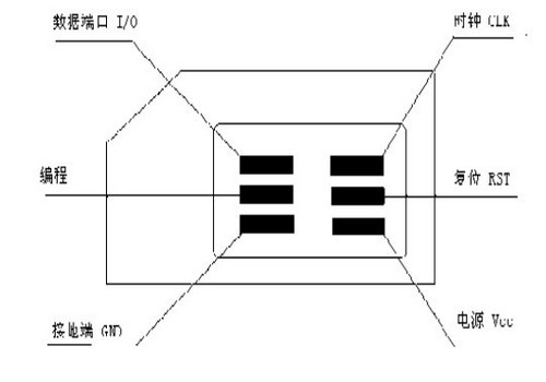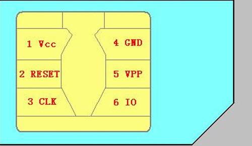 SIM卡在与手机连接时,最少需要5个连接线:电源(Vcc) 、时钟(CLK) 、数据I/O口(Data) 、复位(RST) 、接地端(GND),如下图:
