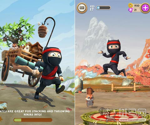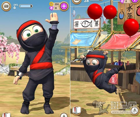 Clumsy Ninja在去年iPhone5 发布时被作为测试游戏演示过,极具东瀛特色的画面,忍者、樱花、房屋、鸟居、充满了浓浓的日本风情。场景画面优美,人物和建筑 3D 建模极为出色,周边几乎看不到任何锯齿,非常顺滑,堪称视觉盛宴!